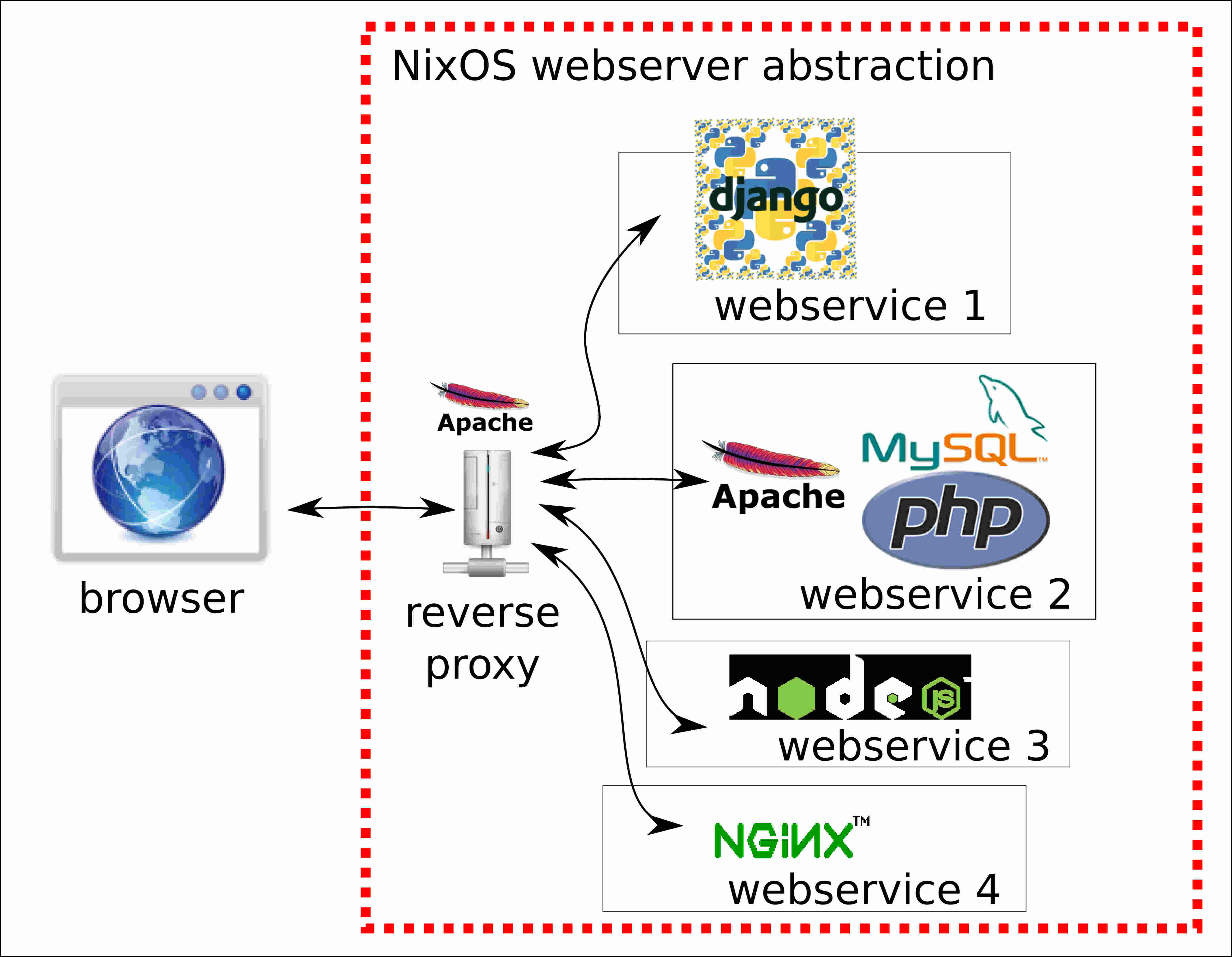 although the declarative approach found in NixOS seems great, it is very unflexible as it forces a rigid dependency model on its users. for example one can only use exactly one php version which needs to be the same for all such services but here i present an idea how to solve this. instead of constraining all webapps to be run on the same webserver, why not have a ‘generic reverse proxy (apache)’ which acts as a frontend and each declaratively described webservice would then use its own, individual mix of webtools like webserver, CGI-based and static/dynamic webpages?