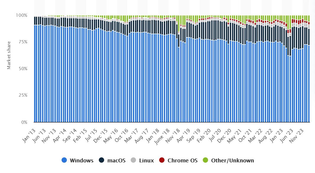 it is worth to have a look at the global market share held by operating systems for desktop PCs, from january 2013 to february 2024:
