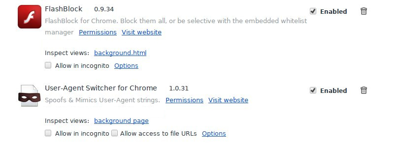 on most webpages i leave the default user agent (which is either chrome or firefox, depending on the browser is use). occationally there is an embedded video and if it relies on flash, then i switch using the ‘browser toolbar’ icon of user agent switcher.