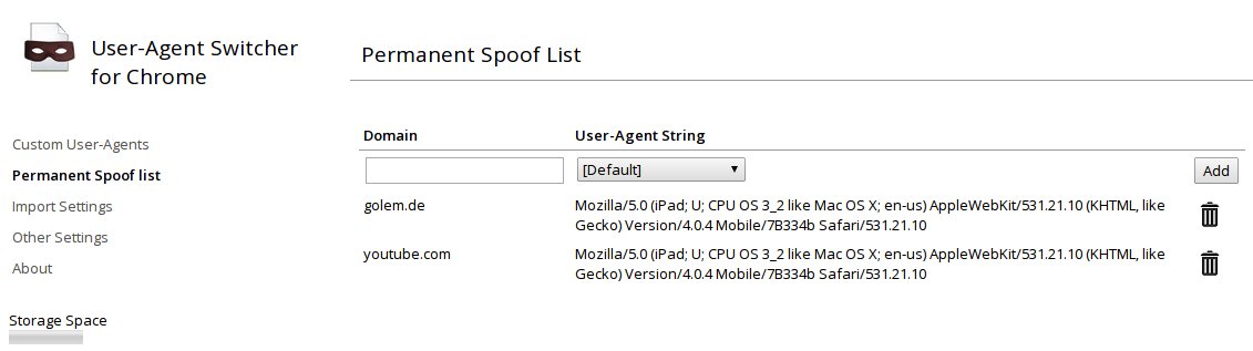 on youtube.com and golem.de, both sites i visit frequenly, i enabled a permanent user-agent spoofing [2]. so now i’m surfing as i was using an ipad. some pages look a little bogus but you get used to! this can be combined with flashblock [3], which blocks the flash execution until one explicitly clicks the flash-app to make it execute.