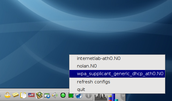 Let’s see how it works: similar to the official ‘network manager’ there is a tray icon. In the case of ‘n0’ or ‘nNull’ there is just a collection of scripts listed. These scripts are handwritten by me and usually work great for my setups. If I want to change the wireless network it gets problematic since i have to edit wpa_supplicant.conf or use wpa_cli. Anyway I can live with that. Here is such a script: