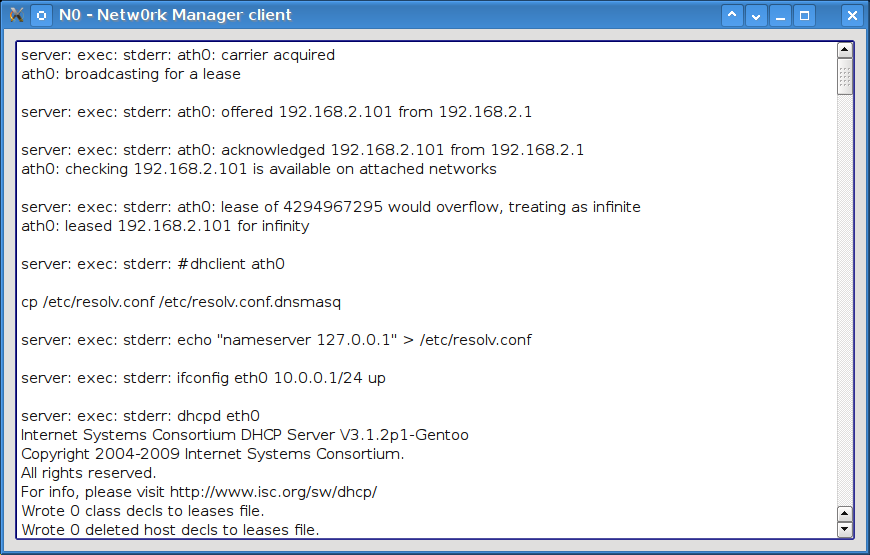 The bonus point is that I get a full blown log of the script execution since it uses “#!/bin/bash -v” which is quite verbose. In the near future i might add another debug line to monitor each process started by the network script. This way one could redirect all outputs to the graphical widget with different coloring for example.