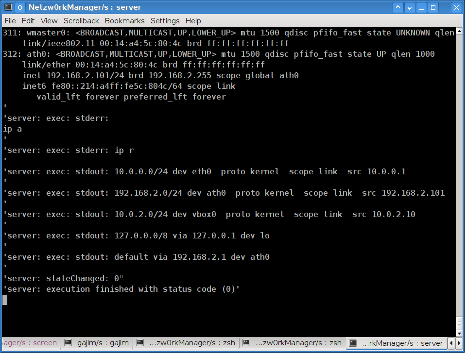 I’ve just finished my own ‘network manager’ (called n0 or nNull) using Qt 4.x with a server and a client communicating via dbus. Here are some screenshots: