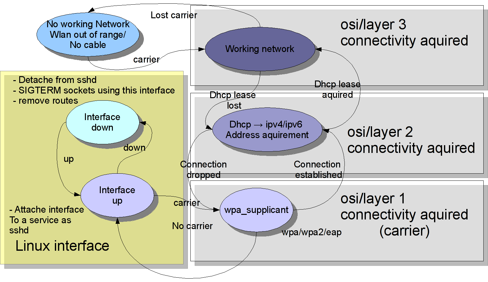regarding the ‘grammar’ above one can think of a ‘pyramid of services’. if one of the services in the middle fails all above have to be restarted (or at least signaled on change). say vpnc fails, we need to reconnect it with all the things one has to do -> removing the current route, reset a new one (probably the same) and prior to that we have to reconnect as soon as the service is known to fail. vpnc for example fails quite some times since. this ‘pyramid of services’ should be visible to the user and a user ‘must have’ the possibility to see the status of every ‘floor’ in this pyramid. if layer 3 connection is working, l3 must light up. if a user wants to restart all services above layer 3 there must be a ‘restart all services above’ button. currently in NM one has to do all the steps from bottom up.